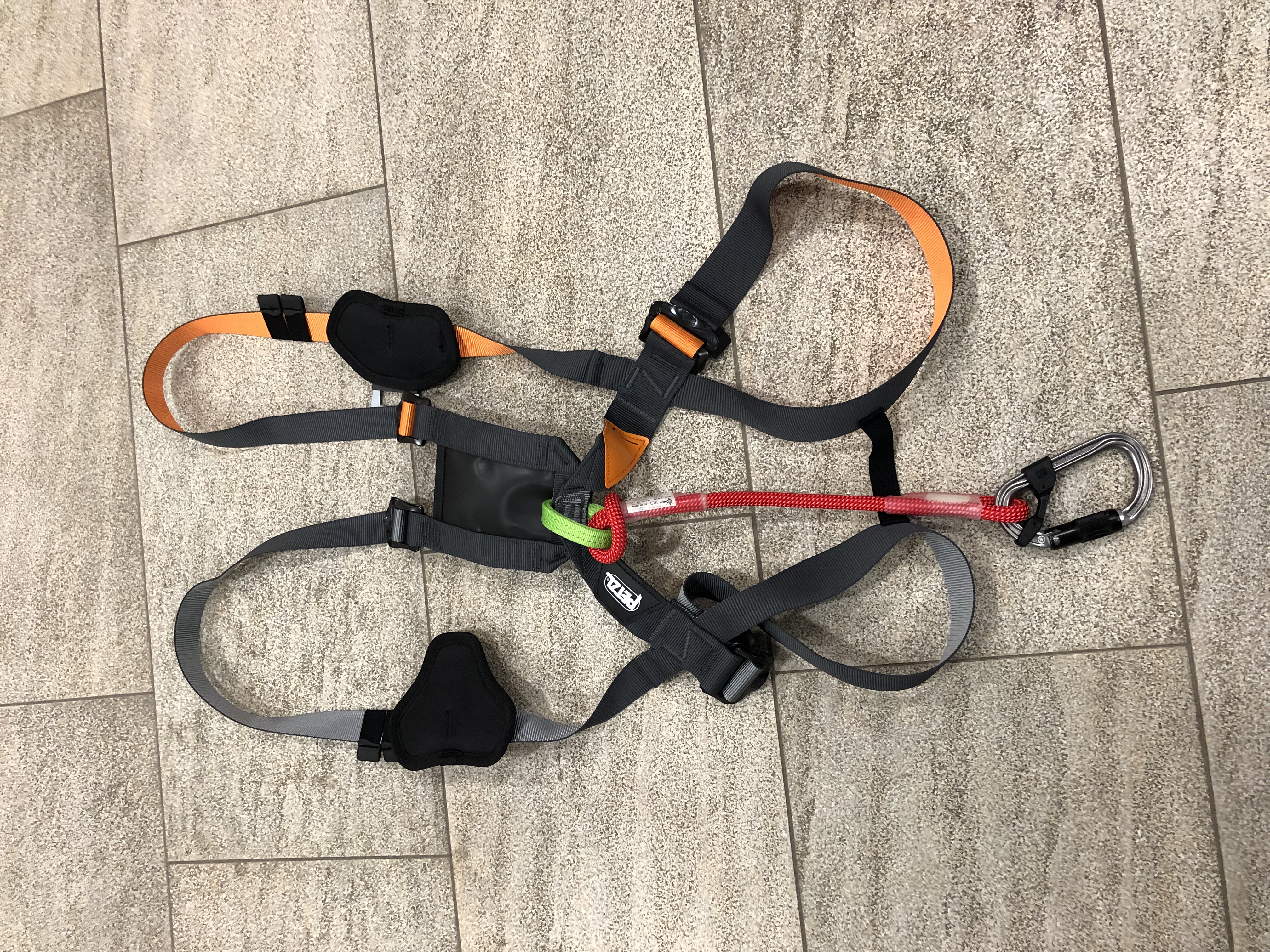 Für die Absturzsicherung darf nur die Öse auf der Vorderseite verwendet werden. Es ist ein kurzes dynamisches Seil mit Karabiner vormontiert. Es kommt kein Bandfalldämpfer zum Einsatz, da dieser erst ab 60 Kg verwendet werden darf.