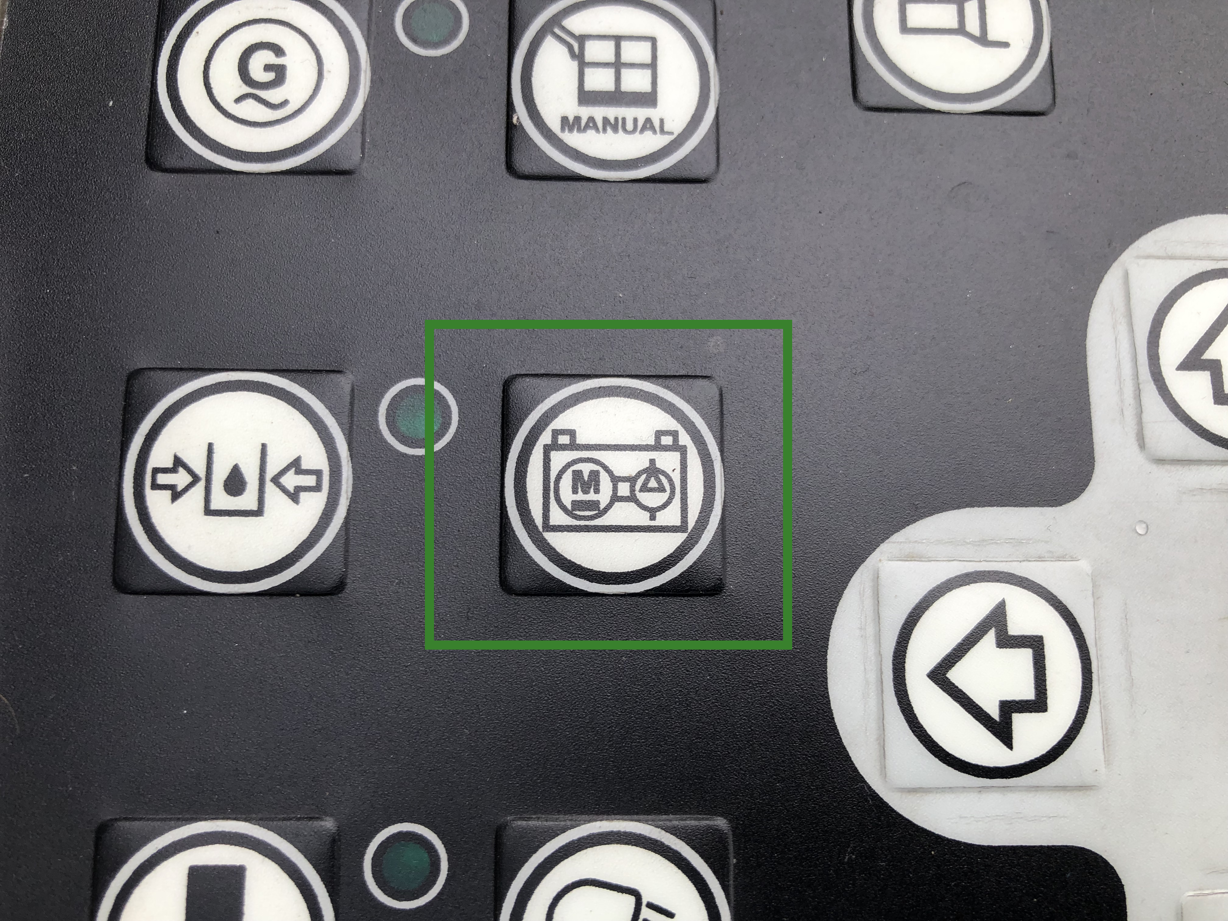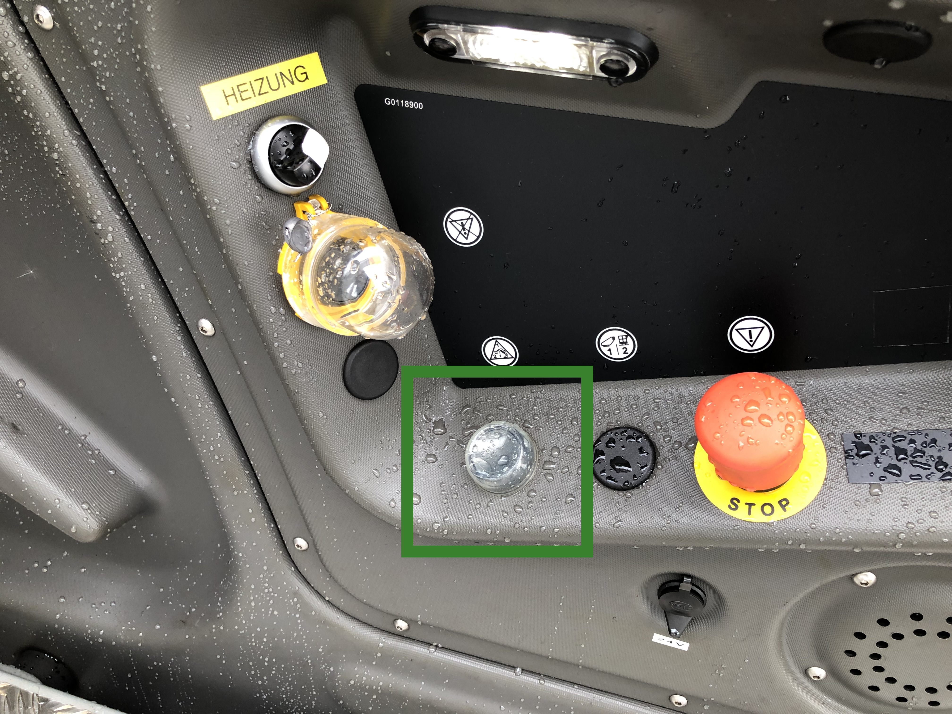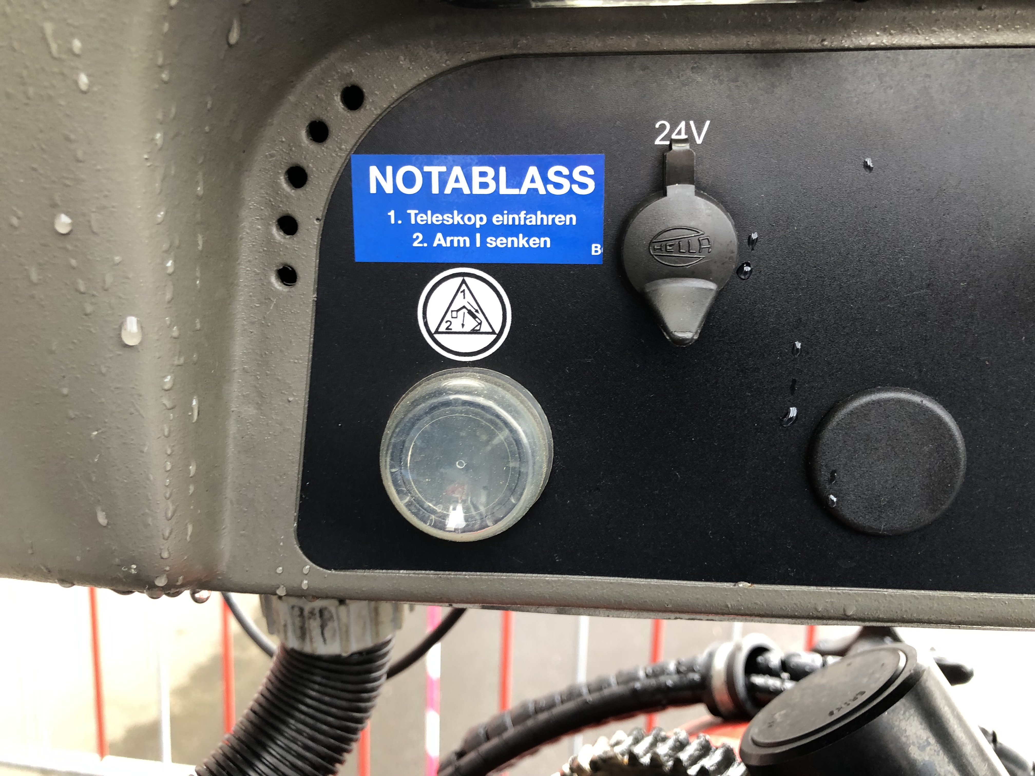 Fällt der Fahrzeugmotor aus, kann kein Druck mehr im Hydrauliksystem aufgebaut werden. Als Notsystem ist eine Hydraulikpumpe verbaut, welche durch die Fahrzeugbatterie angetrieben werden kann. Diese wird mit folgendem Taster aktiviert.